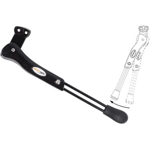 ATRAN VELO achtervorkstandaard Stylo DV – NH1 Traploos verstelbaar 24-28, met een om 11° grotere hoek van de standpositie naar voren Directe montage op liggende achtervork (alleen voor frames met passende opname), gatafstand 18 mm, montage op de buitenkant van het frame, ook goed geschikt voor E-bikes, onder druk gegoten alu, poedergecoat, kunststof voet zwart, in polyzakje artikelnummer leverancier 1226-4NH1.